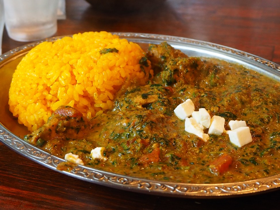 夫はほうれん草とチキンカレーにしました。ここのお店はどのカレーにもナンではなく、ターメリックライスが添えられています。具材たっぷりで程よいルーのかたさの加減がライスとよく合います。